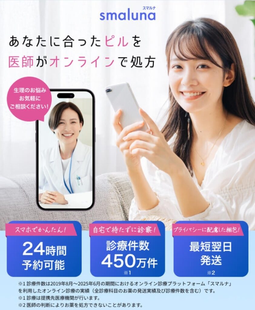 ![]() ![]() スマルナ | 診察料0円 (低用量ピル) | 550円 (12シート一括プランの場合は無料) | ・クレジットカード ・NP後払い |