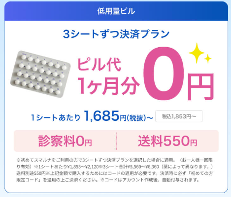 スマルナ→診察料無料・12シート一括プランの場合は送料も無料(低用量ピル)